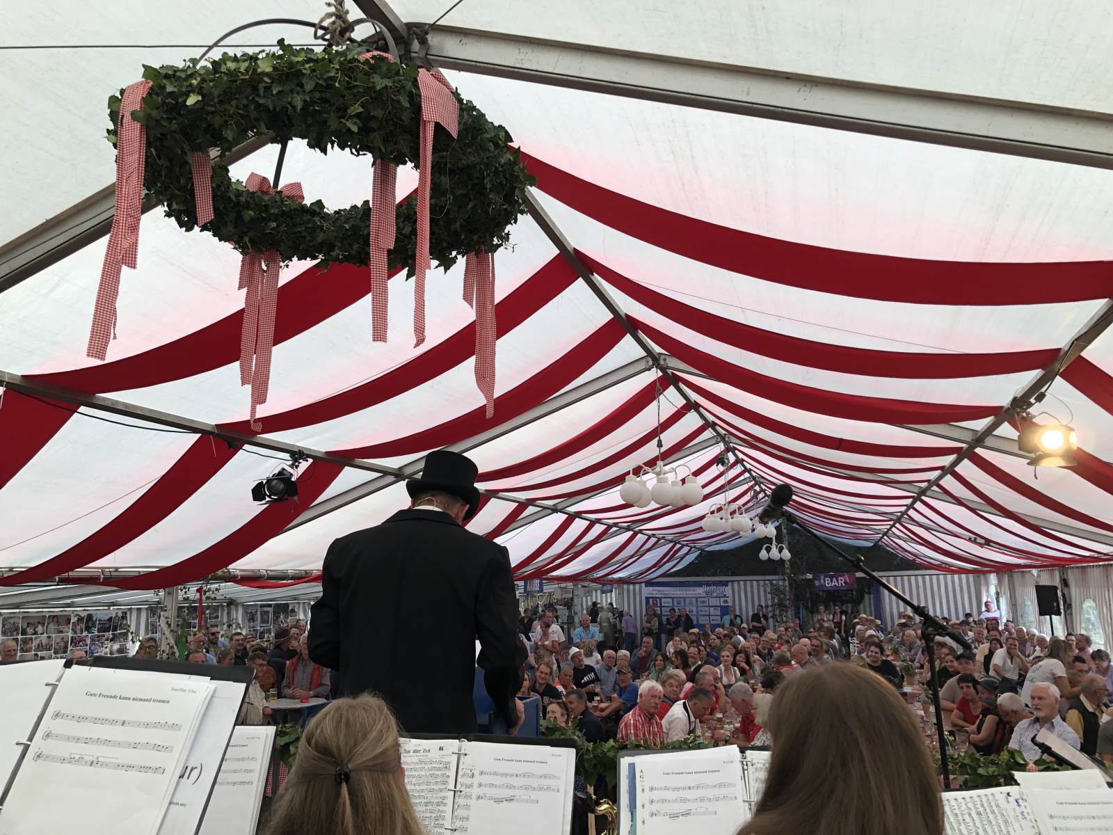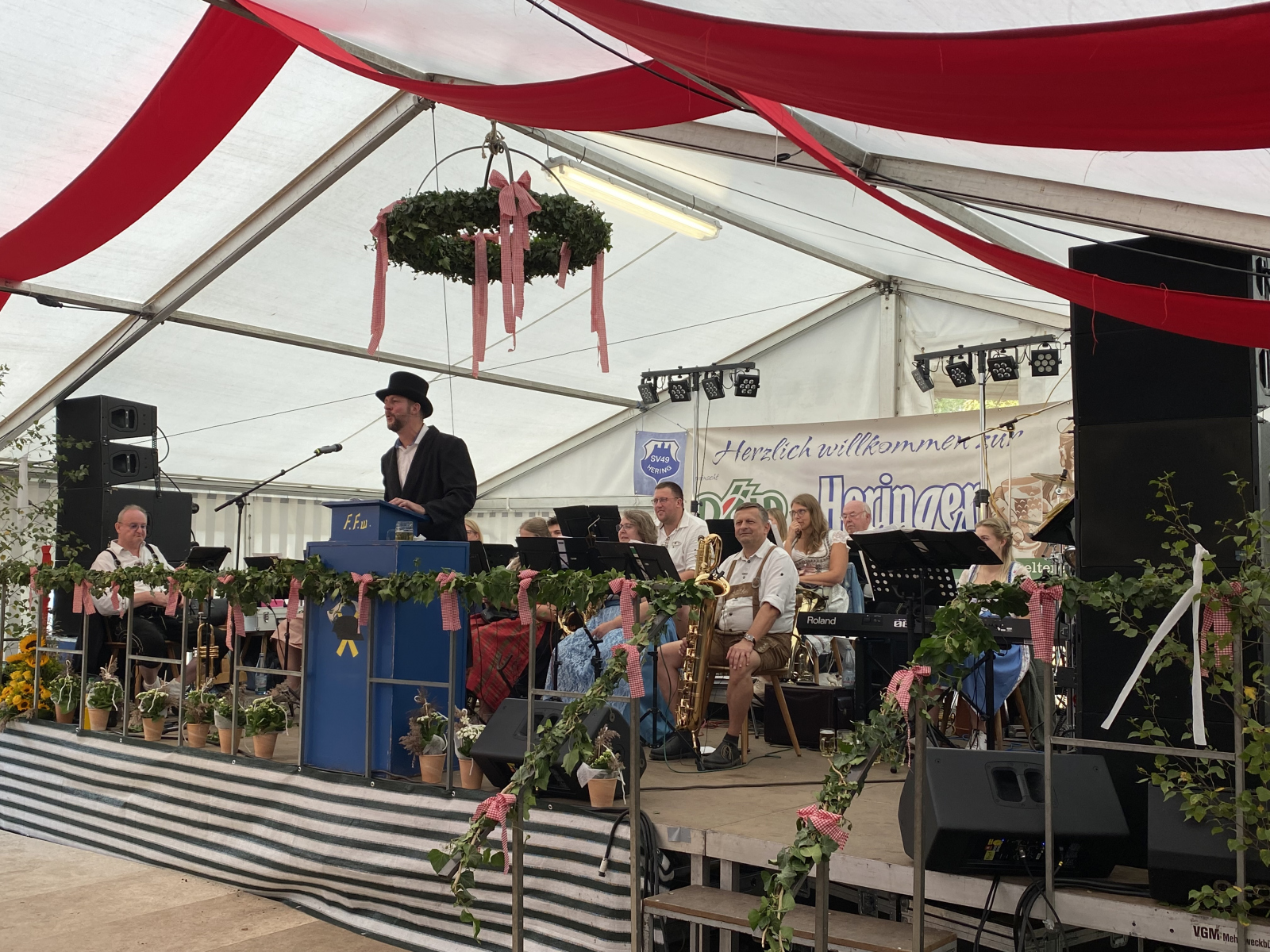 Es konnte endlich wieder losgehen! Sonntagmittag, 14 Uhr und der alljährliche Kerbumzug auf dem Hering setzte sich in Bewegung. Sowohl die Teilnehmer des Umzugs als auch die zahlreichen Besucher in den Straßen und Häusern waren bester Laune. Es schien als hätte die Heringer Kerb ihren eigenen Schutzpatron, der es wohl gut mit uns meinte, denn die am Horizont aufziehenden Regenwolken zogen prompt am Hering vorbei. So erreichten Umzug und Zuschauer ungebremst bei bestem Wetter den Festplatz, wo es nach einer kurzen Pause mit unserer Unterhaltungsmusik im Festzelt weiterging. Dass die Kerb auf dem Hering einer besonders fürsorglichen Planung durch das bestens aufgestellte Kerb Team unterstellt ist, wurde sofort durch die sorgfältige Dekoration im und am Festzelt deutlich, so hatte man dieses Jahr sogar eigens eine Tanzfläche aus Europaletten und Spanplatten vor die Bühne gezimmert und vor dem Zelt einen gemütlichen Biergarten geschaffen. Vor dem Kerbspruch stimmten wir das Festzelt schonmal auf einen klangvollen, unterhaltsamen Abend ein.