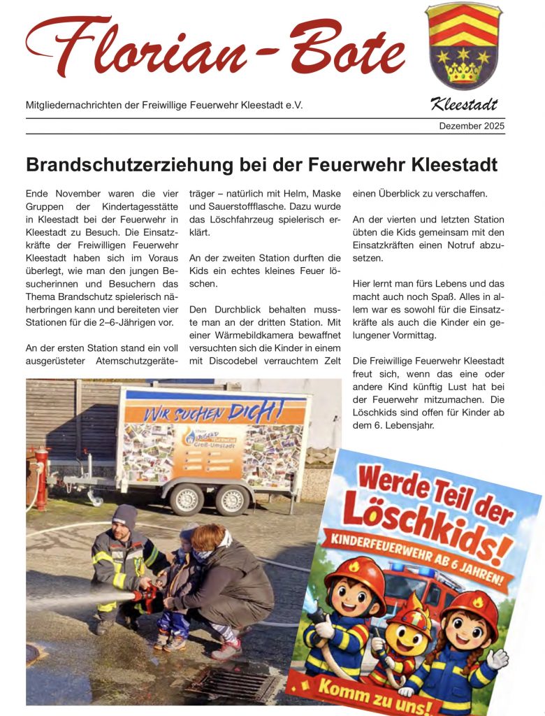 Wie in jedem Jahr bringt die Freiwillige Feuerwehr Kleestadt mindestens einen Florian – Boten raus. Seit Ende letzten Jahres sollte den auch jeder Haushalt in Kleestadt im Briefkasten finden. Einen kleinen Rückblick gibt die aktuelle Ausgabe über das abgelaufene Jahr.