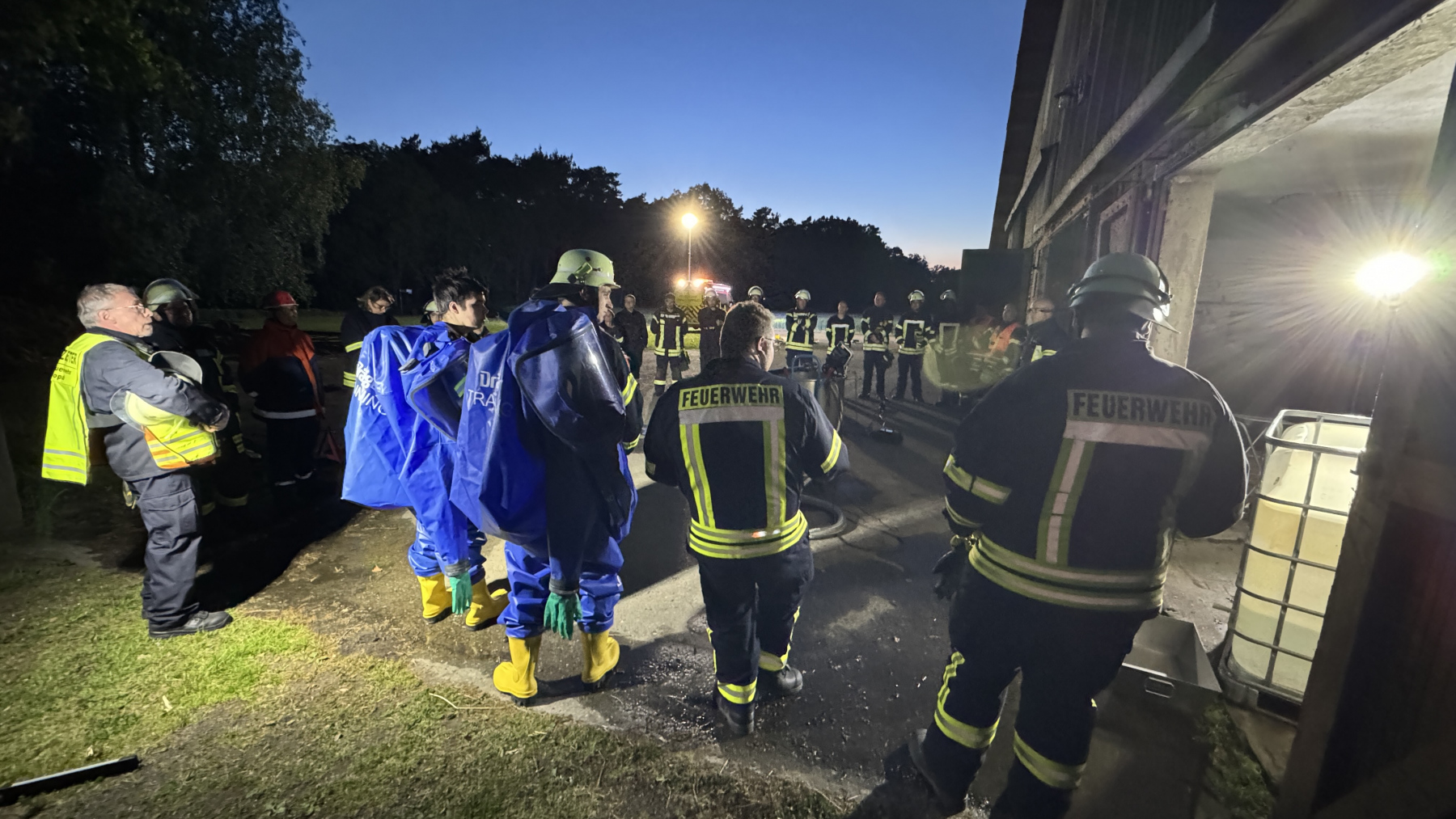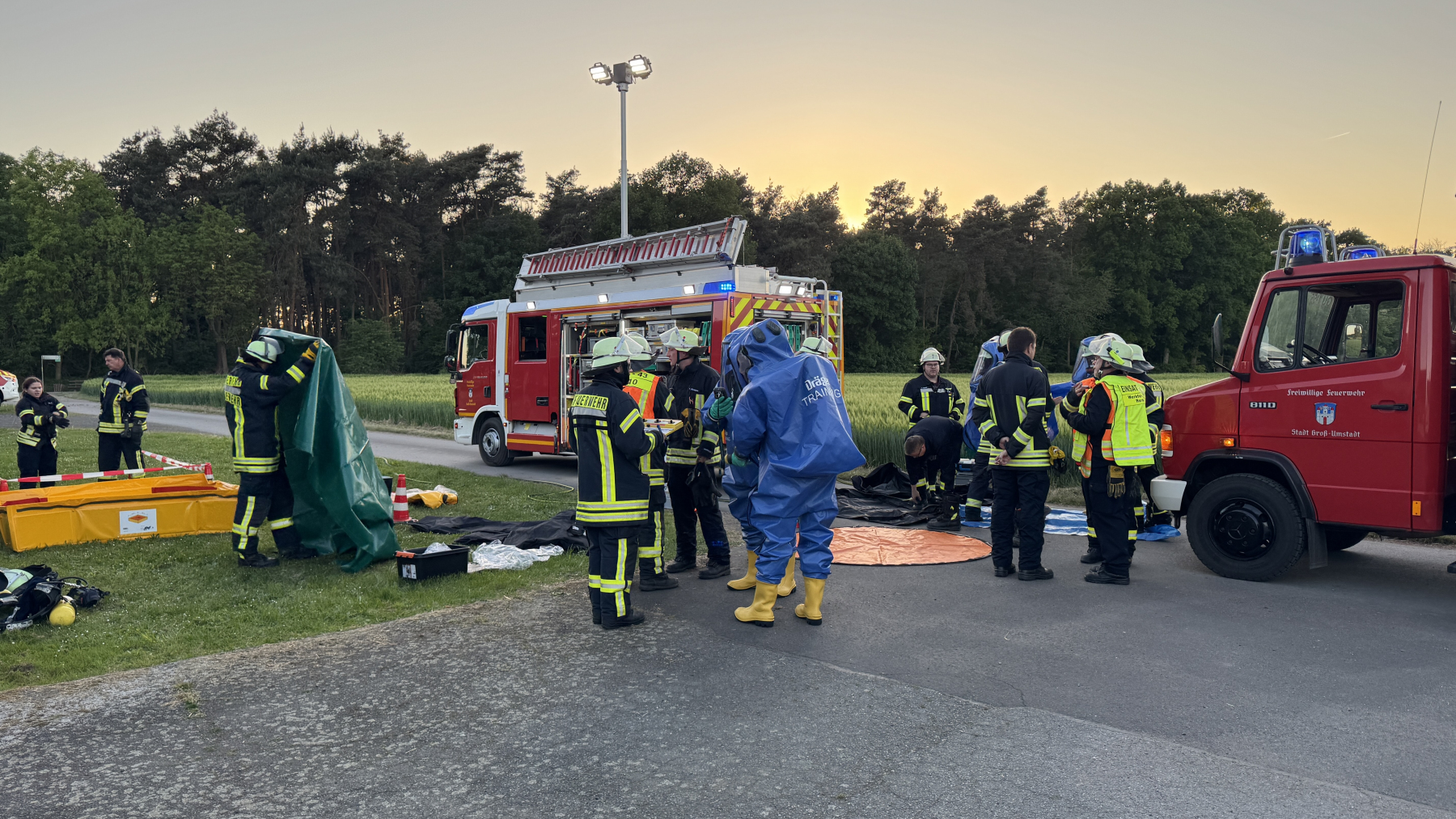 Die angenommene Lage: Ein Traktor hatte beim rangieren einen mit Schwefelsäure gefüllten IBC-Behälter beschädigt, wodurch es zu einer Leckage und in der Folge zu einem Stoffaustritt kam. Zudem wurde ein Mitarbeiter verletzt, der sich nicht selbstständig in Sicherheit bringen konnte.