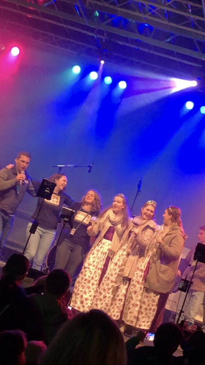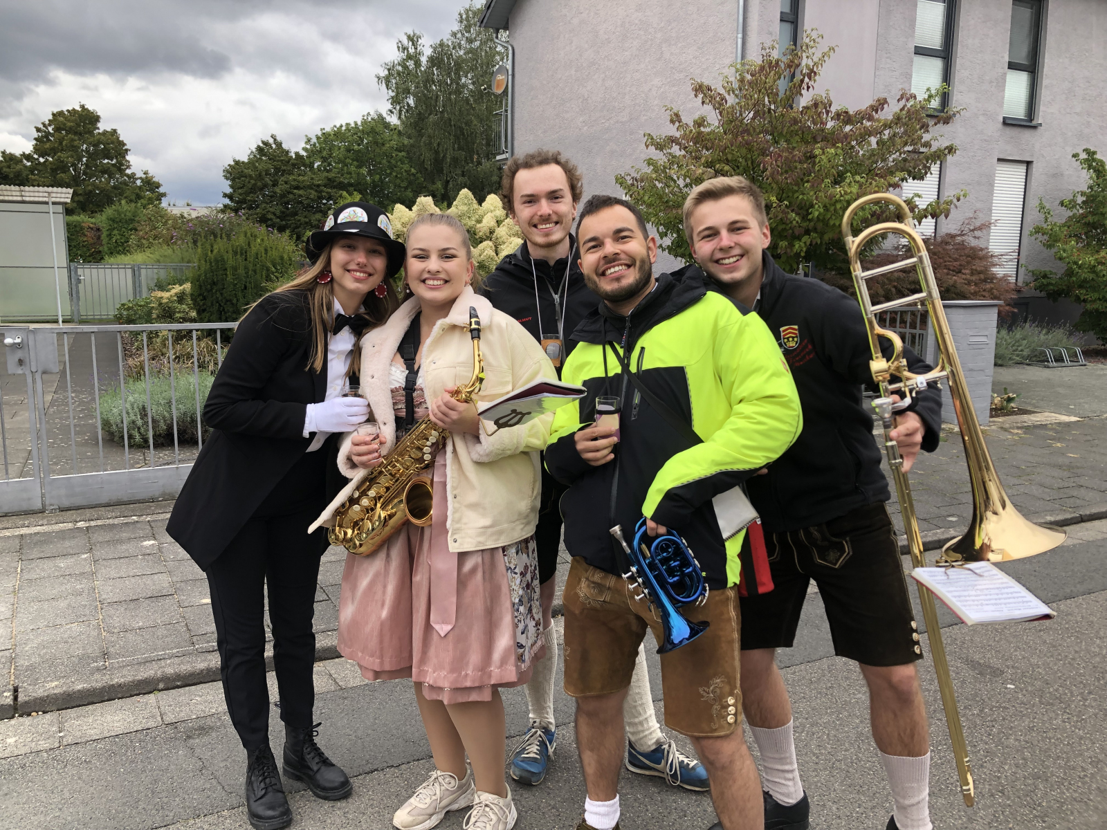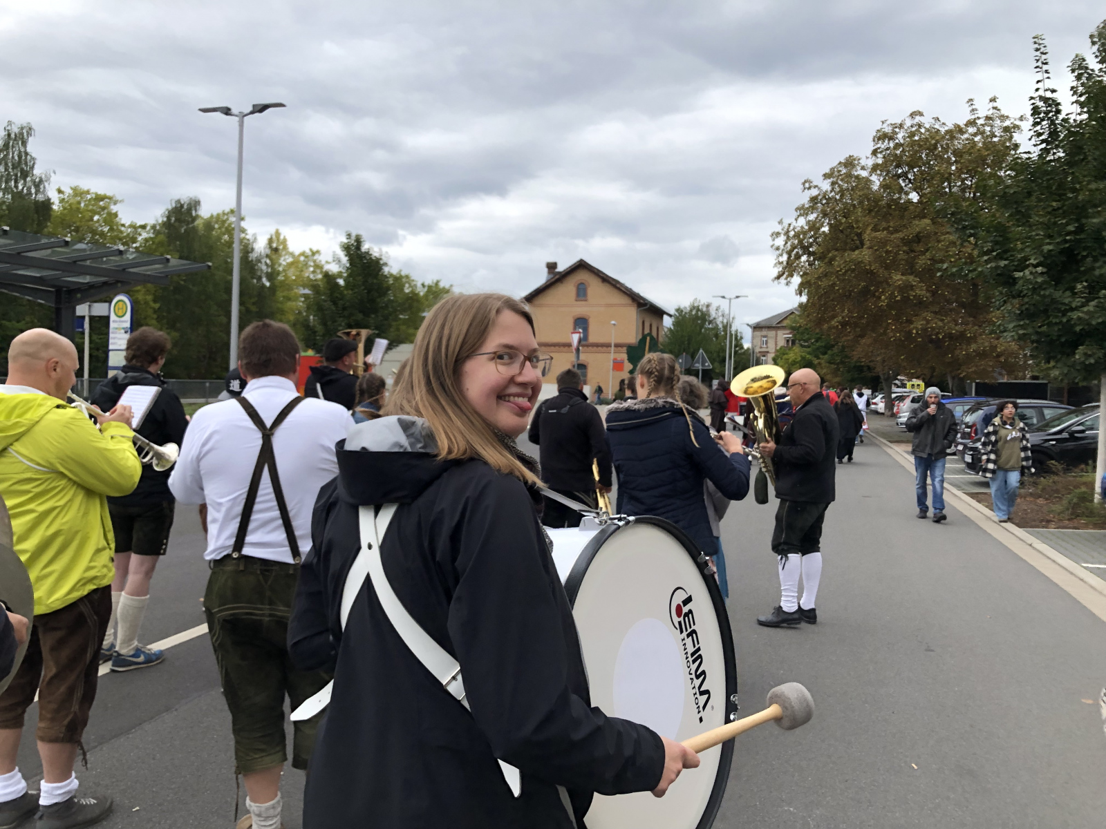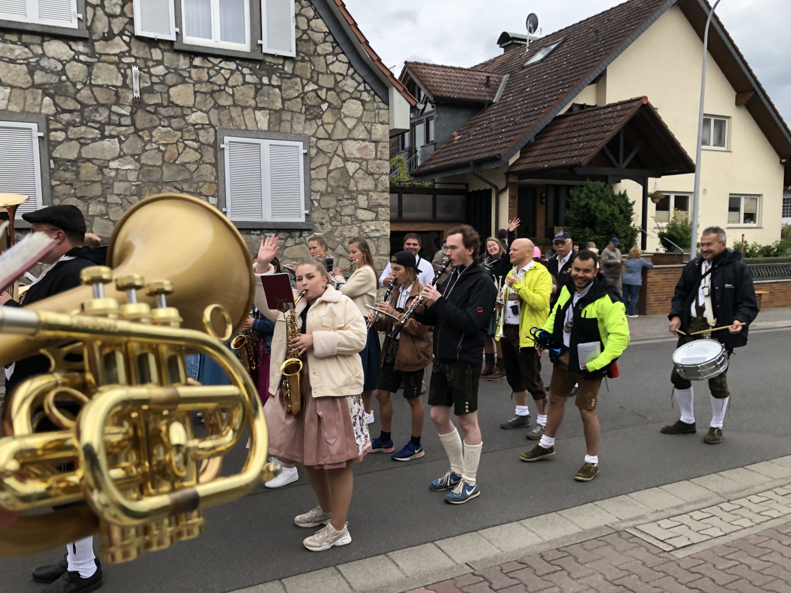 Wir spielten beispielsweise die Kult-Hits, „Was wär de Woi ohne Könischin“ und „Winzerfest in Umstadt“. Diese in Umstadt weitverbreiteten Lieder rund ums Winzerfest, wurden eigens von der Woi-Rockband Los Veteranos gedichtet, welche man wohl als die Schöpfer dieses Musikgenres, eine Symbiose aus Wein, Klultur und Muik, bezeichnen könnte. Trotz niedriger vorhergesagter Temperaturen und hoher Regenwahrscheinlichkeit waren die einzigen Tropfen, die uns erreichten, die des ausgeschenkten bzw. verschütteten Weins. Unser Glück mit dem Wetter erinnerte an die kürzlich erlebte Heringer Kerb, wo es ähnlich lief, und so muss es wohl diesmal Bachus gewesen sein, der es gut mit uns meinte. Nachdem der Umzug am Bahnhof offiziell endete, zogen wir, so wie die Besucher die zuvor aufmerksam den Umzug verfolgt hatten, ebenfalls aufs Festgelände, wo man daraufhin die ein oder andere Lederhose oder das ein oder andere Dirndl aus unserer Reihe an einem der vielzähligen Weinstände sichten konnte aber diesmal ohne Instrumente.